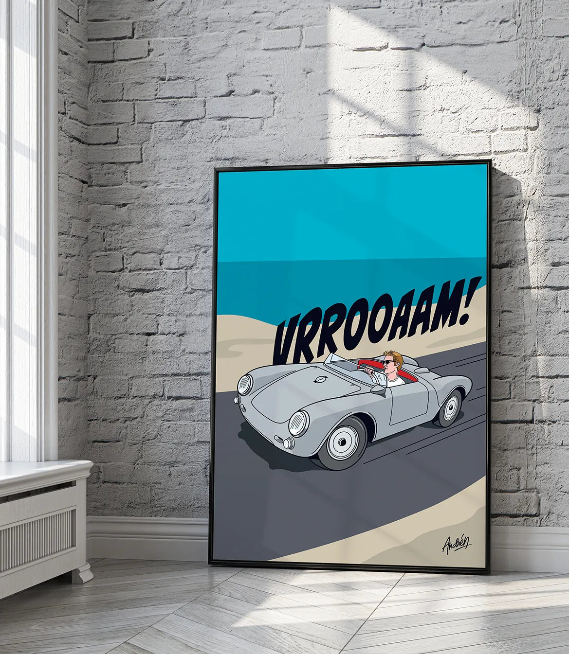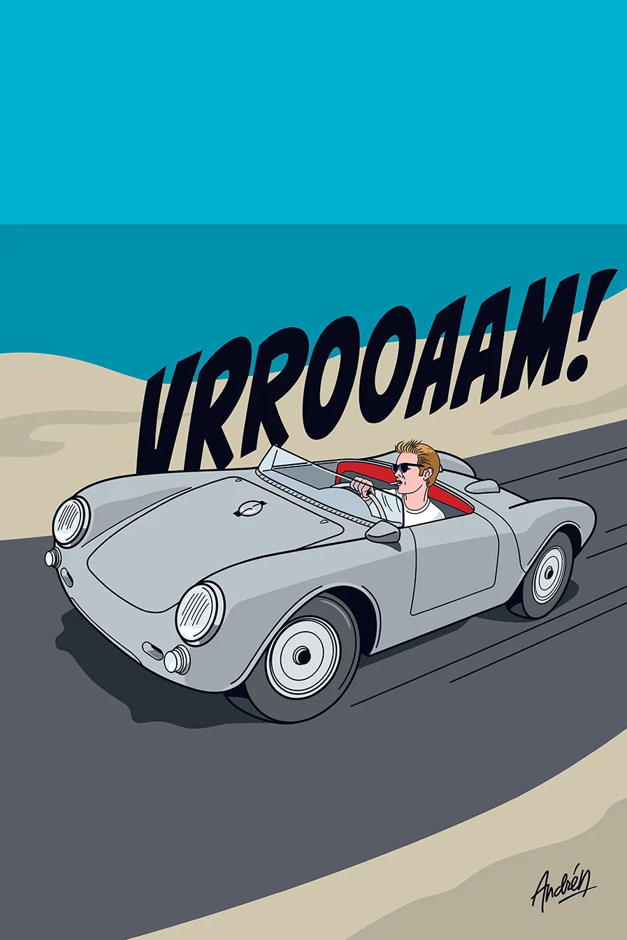 Andren has always had a passion for fast cars, among other things. This original artwork is based on comic book art; the illustration was done using a scaled 550A Spyder model. A slightly different horizontal version is also available.