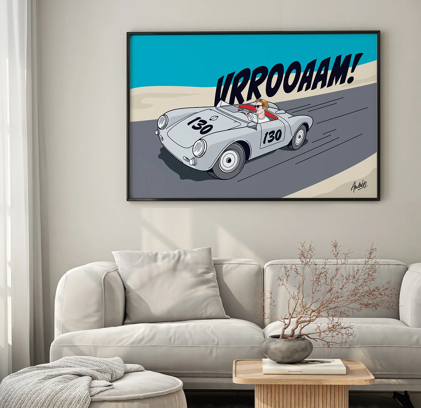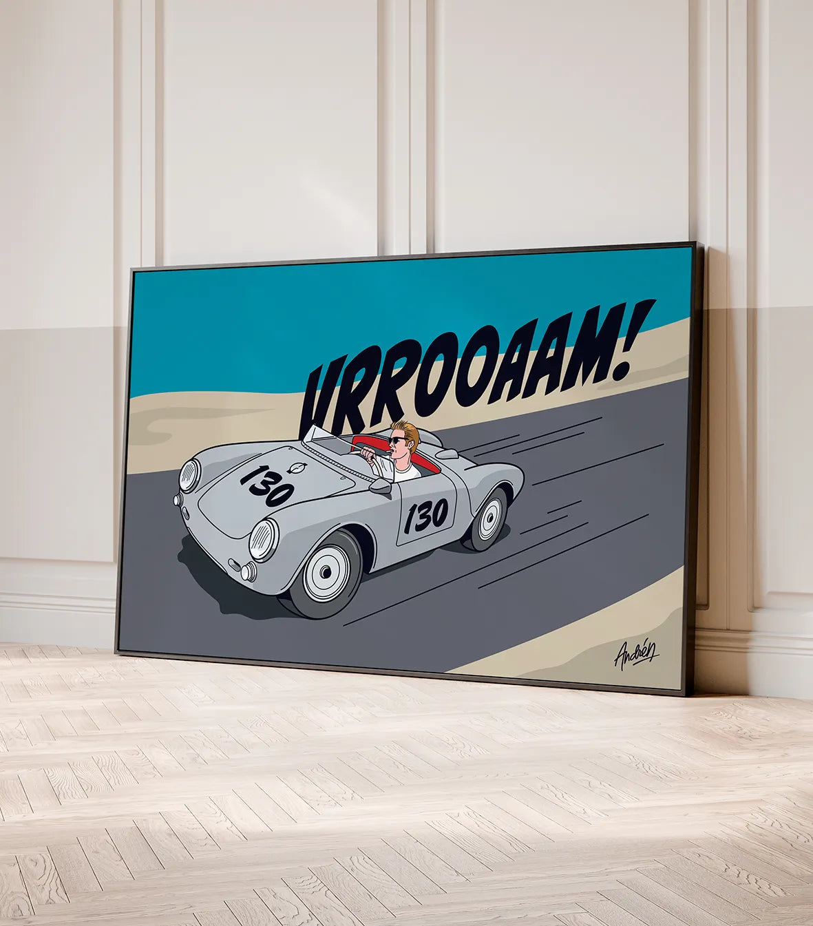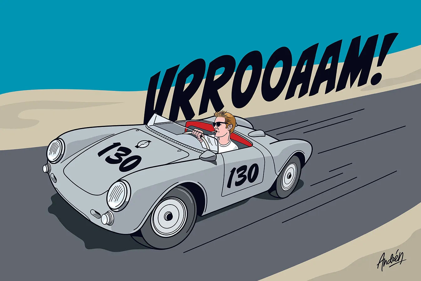 Andren has always had a passion for fast cars, among other things. This original artwork is based on comic book art; the illustration was done using a scaled 550A Spyder model. A slightly different vertical version is also available.