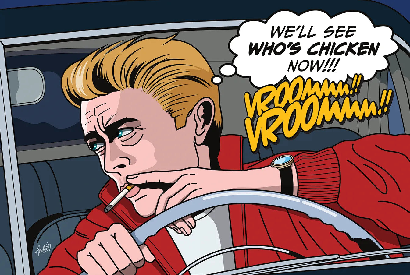 Illustration created from a scene of the American drama film Rebel Without a Cause, starring James Dean. The film, a classic tale of youth rebellion, was released in 1955, nearly a month after Dean's death in a car crash.